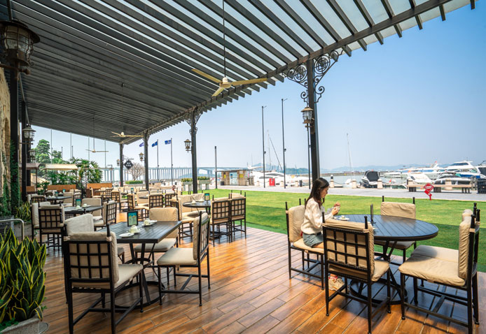 出海暢游一天后,夜幕低垂,最大的享受莫過于在戶外露臺與親朋摯友一面品嘗美食,回味卡布奇諾,一面盡瞰美麗的海灣景色。咖啡廳外的特色石廊和如蔭草坪也是年會活動、客戶歡聚的適宜場地,無論是舉辦正式的燭光長桌晚宴,還是小型私享音樂會搭配BBQ燒烤自助餐,揚帆廊咖啡廳都將是您的至佳選擇。